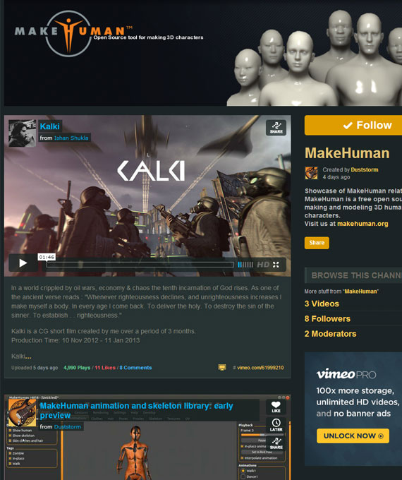 Makehuman is an exciting software. All the characters you see in Kalki had there base meshes created from Makehuman. The new version looks very exciting too. Thanks to their team for featuring Kalki on their facebook, google & Vimeo page.